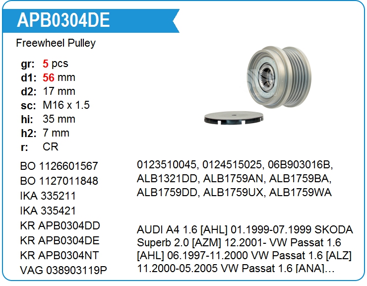 | KRAUF | APB0304DE | Шкив генератора обгонный | МСК | 5 400,00 руб. | |